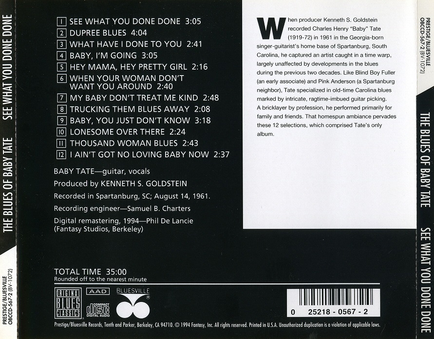 Así fue,que de este desconcierto salio "The Blues Off Baby Tate..." su único testamento en acetato para una irregular carrera que tuvo su punto fuerte en las sesentas canciones que registro para el historiador y folclorista Peter B. Lowry en el 71 y que lamentablemente fueron dadas a conocer después de la muerte de este particular bluesman.